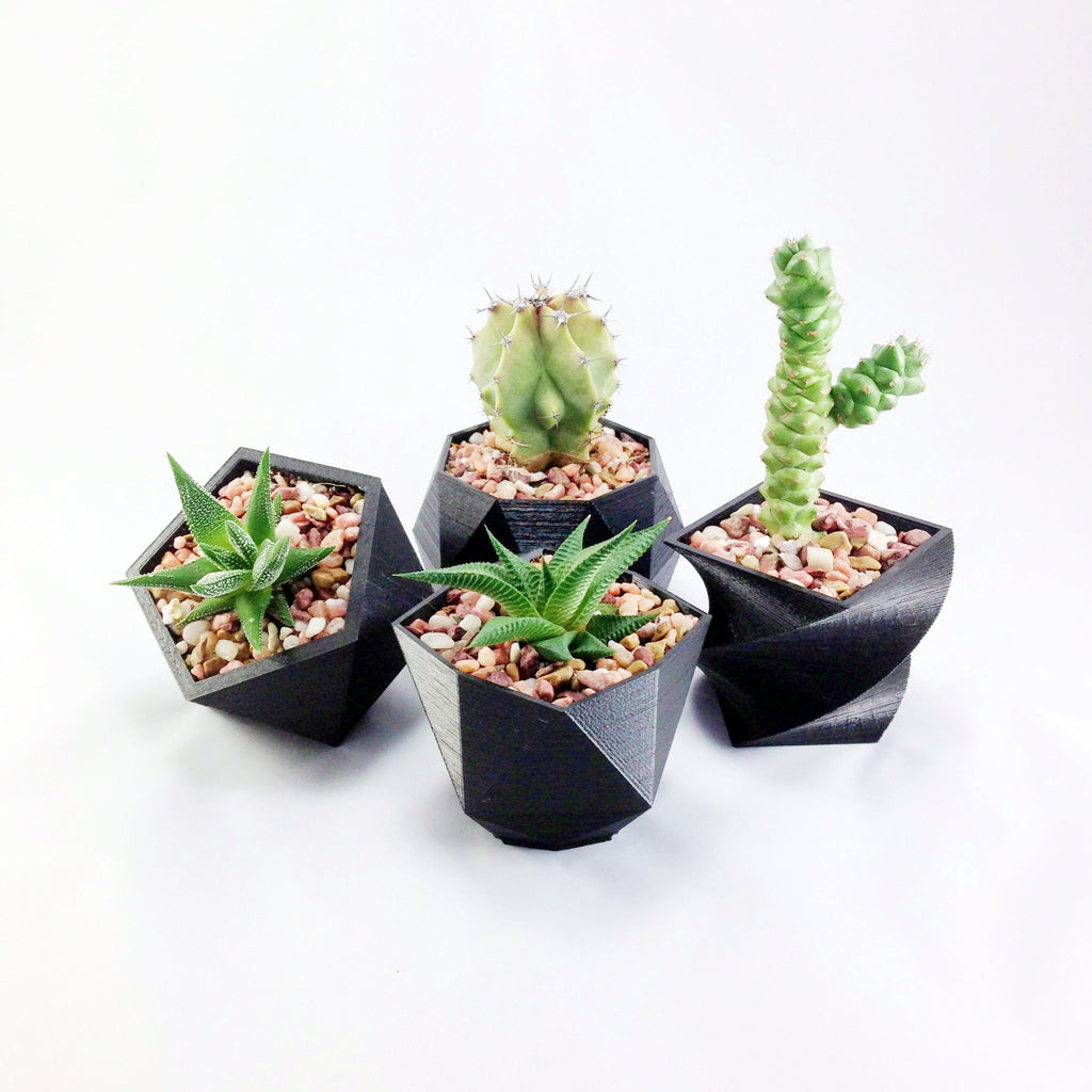 A set of 4 mini 3D printed planters, each its own geometric design. These pots are perfect for cacti, offsets, and seedlings! As an avid cactus collector I happen to have lots of tiny plants, and thought it would be fun to whip up some mini pots for them. 3D printed with eco-friendly PLA plastic filament, these pots are light yet very strong! Many color options available. Plants not included.