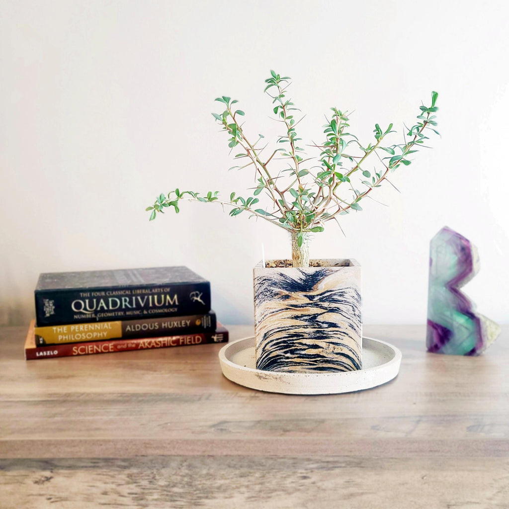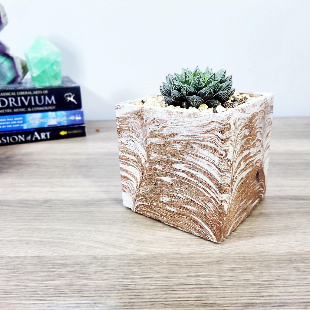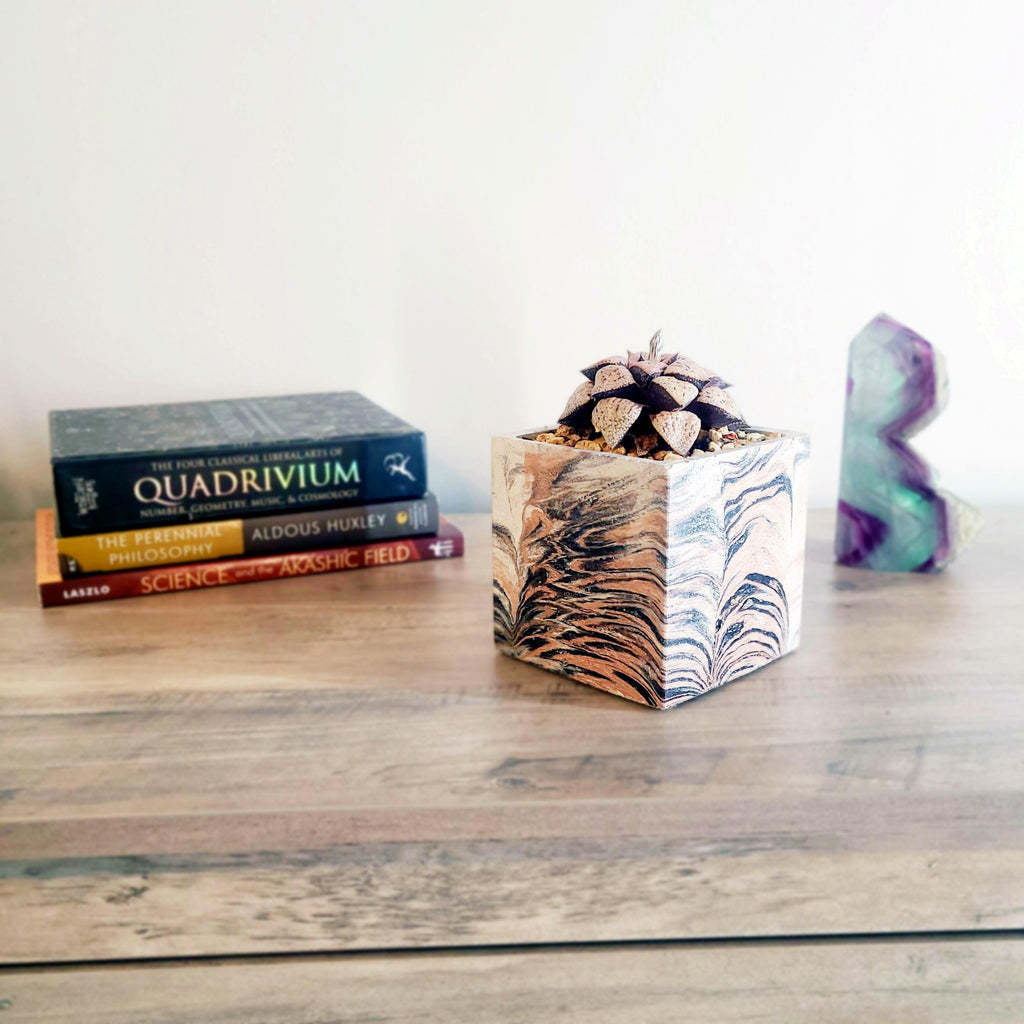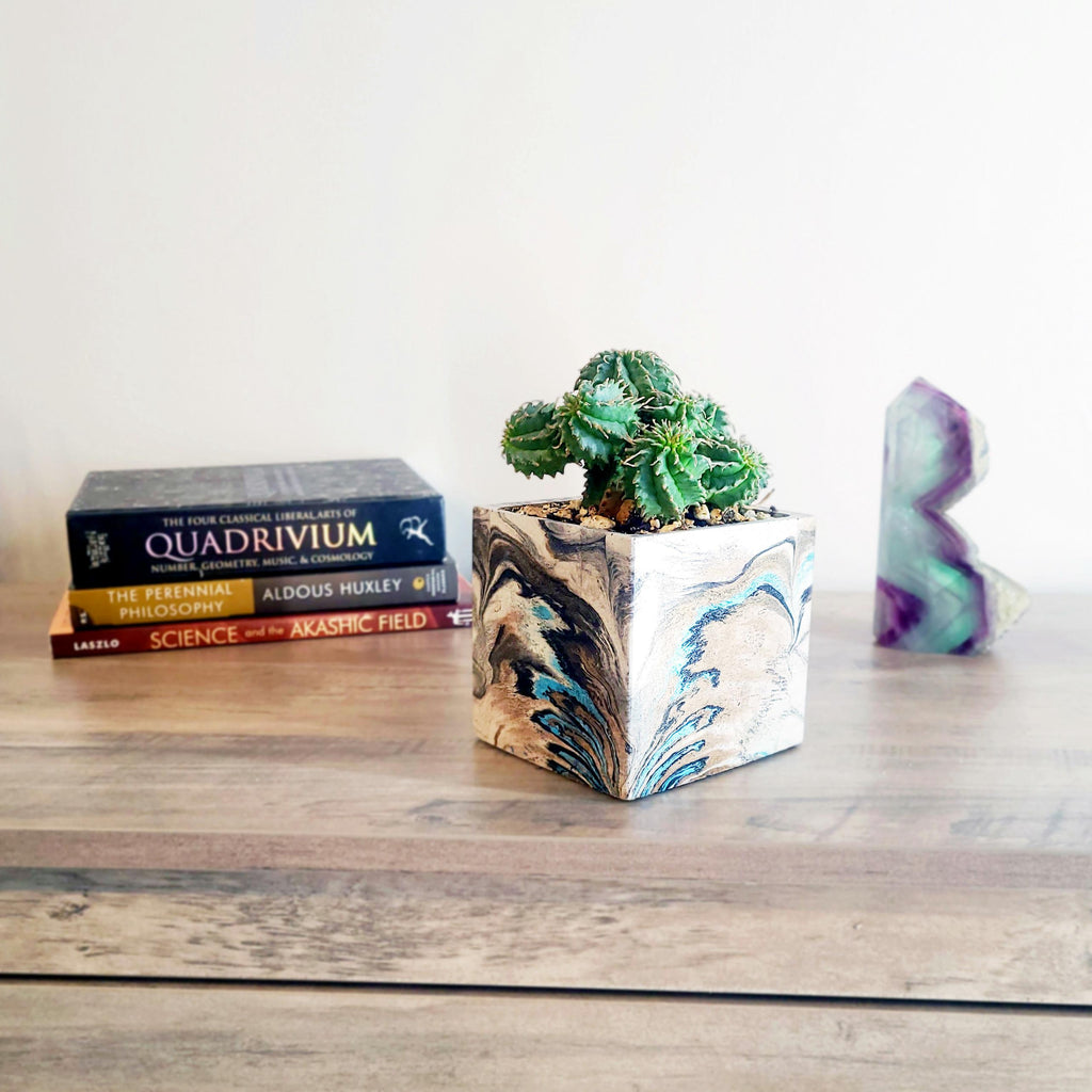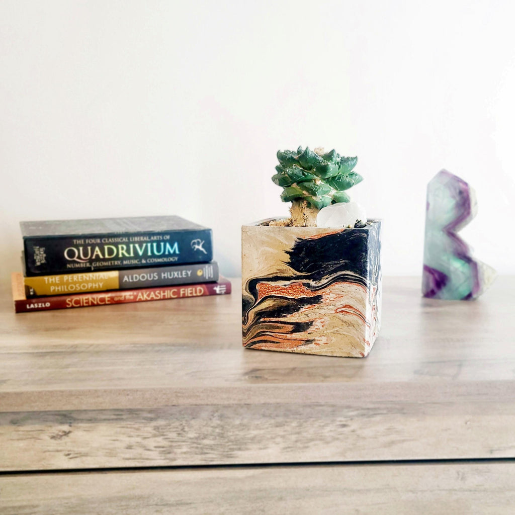 Elevate your space with this handmade square marbled concrete planter. Each pot is hand-poured with a swirling pattern that creates a one-of-a-kind marbled finish. Perfect for succulents, cacti, or small houseplants, its compact shape suits desktops, shelves, and windowsills. The versatile design complements modern, minimalist, boho, and industrial interiors.