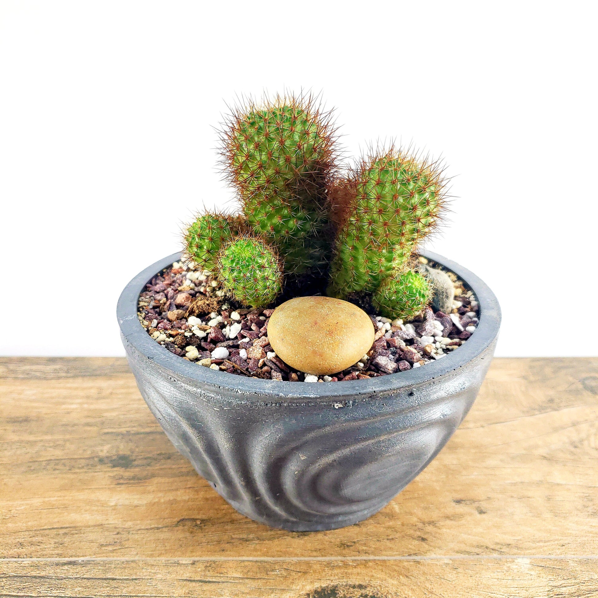An edgy, sleek concrete planter with an undulating wave design that creates interesting geometric patterns, like drops of water on a pond. Sturdy, strong, and stable; this would look just as good on your desk as on your patio. Suitable for indoor and outdoor use, these pots are hand-casted with a high quality concrete mix for durability and finished texture. Drain hole is optional, and a wealth of color options are available.