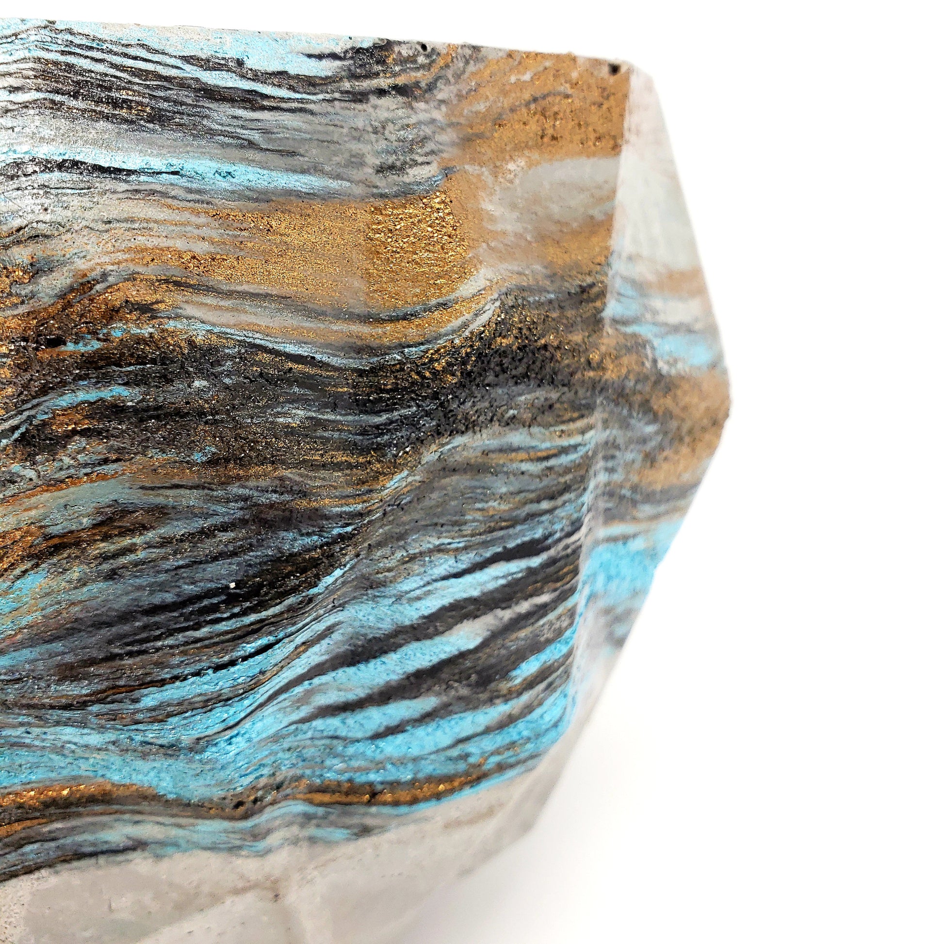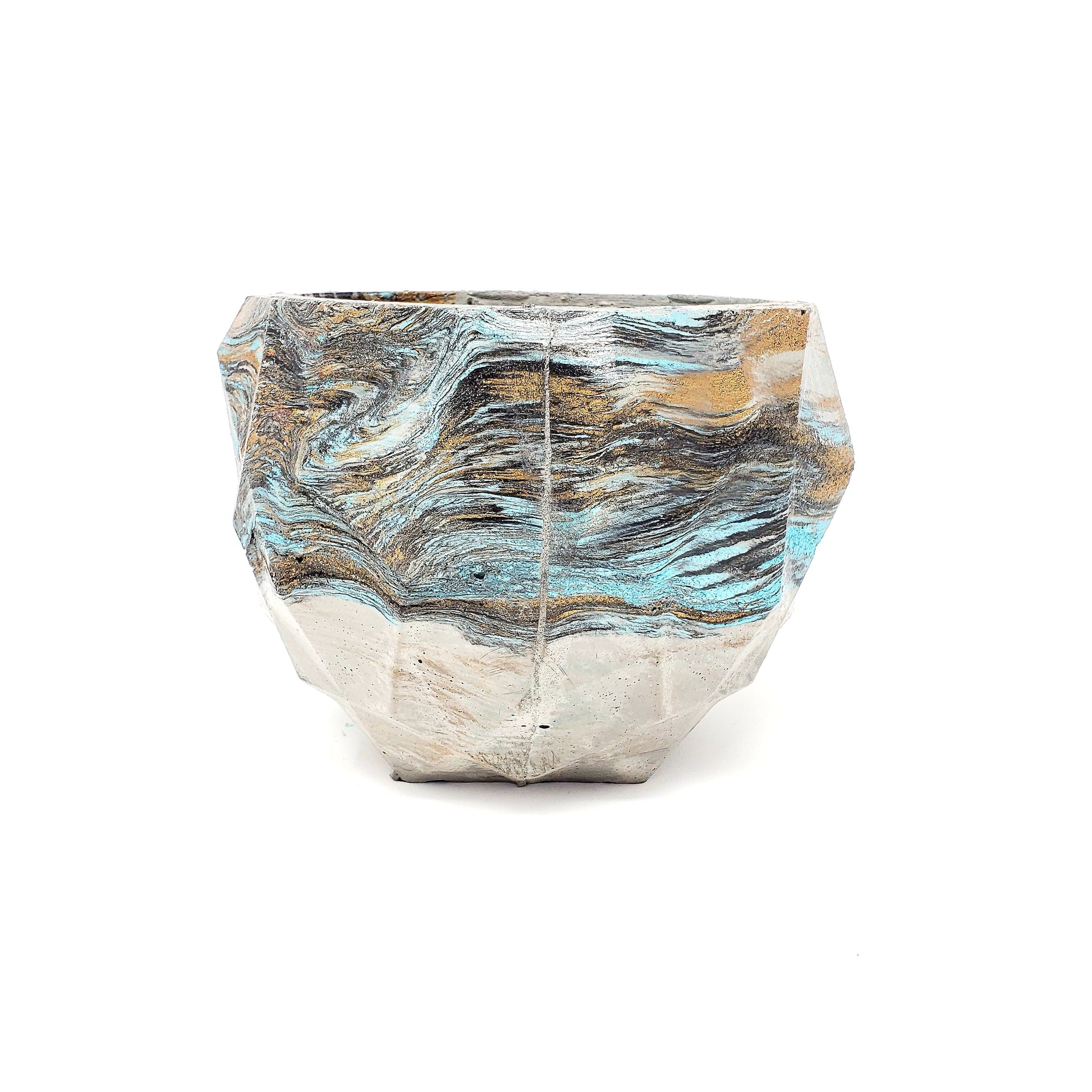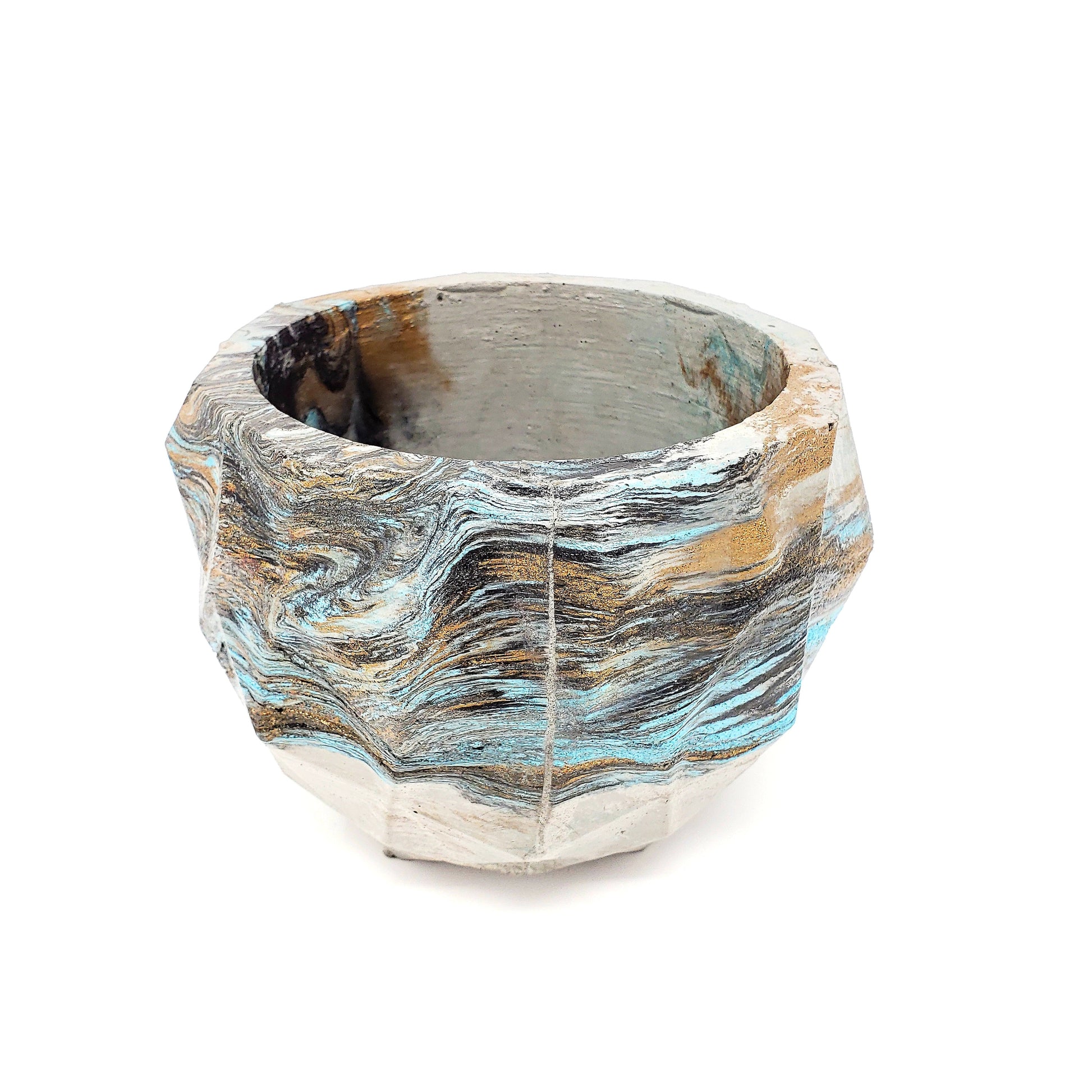 Personalize your space with a geometric concrete planter. A large, sleek, and solid geometric concrete plant pot with many edges and faces that gleam in the sun and cast interesting shadows. Entirely handmade from concrete, the edgy planter pot has a multicolor, textured effect, although the one in the examples has a blue-black color combination, each planter will be unique, the same color but texture will vary. Bring some color and greenery to your space with a planter made just for you!