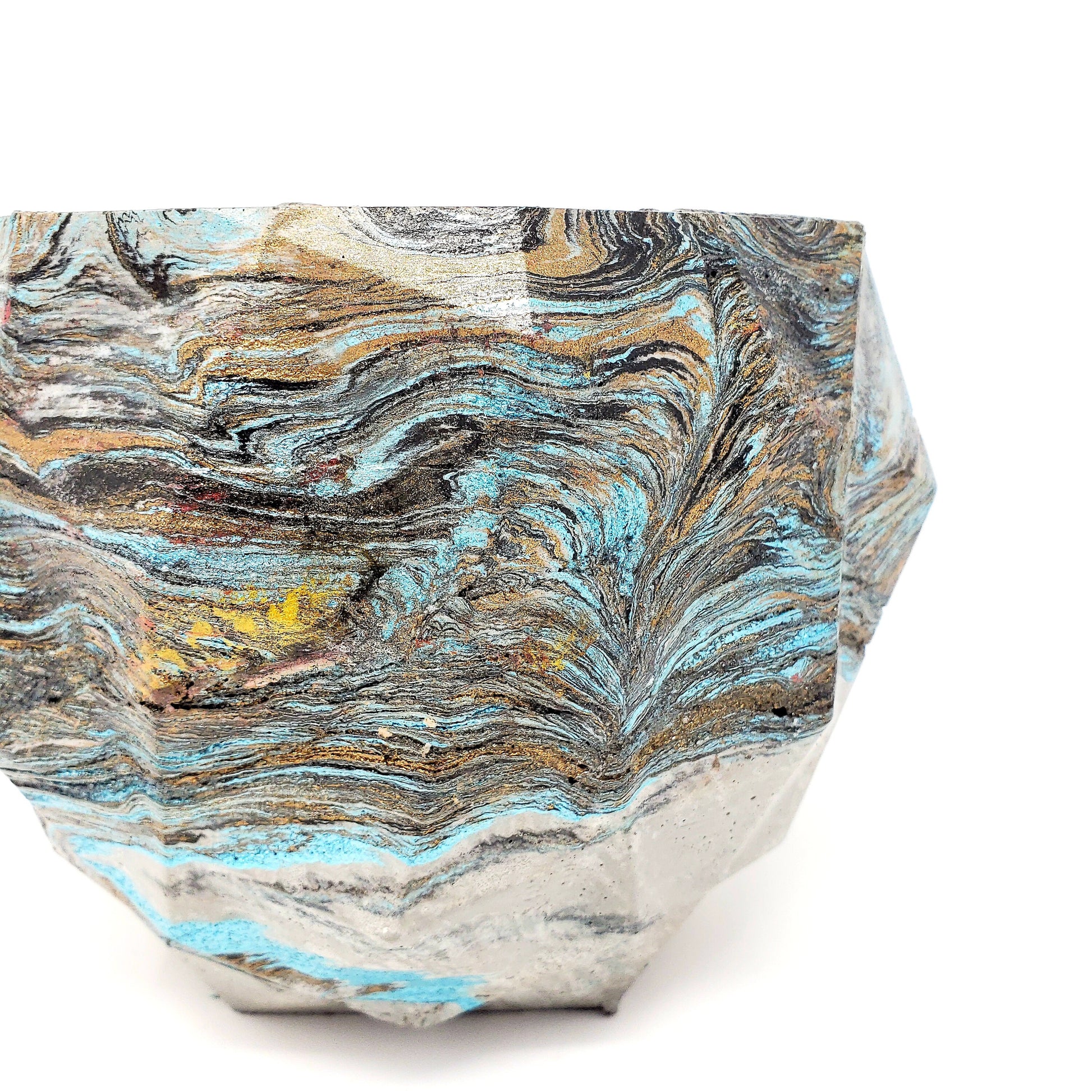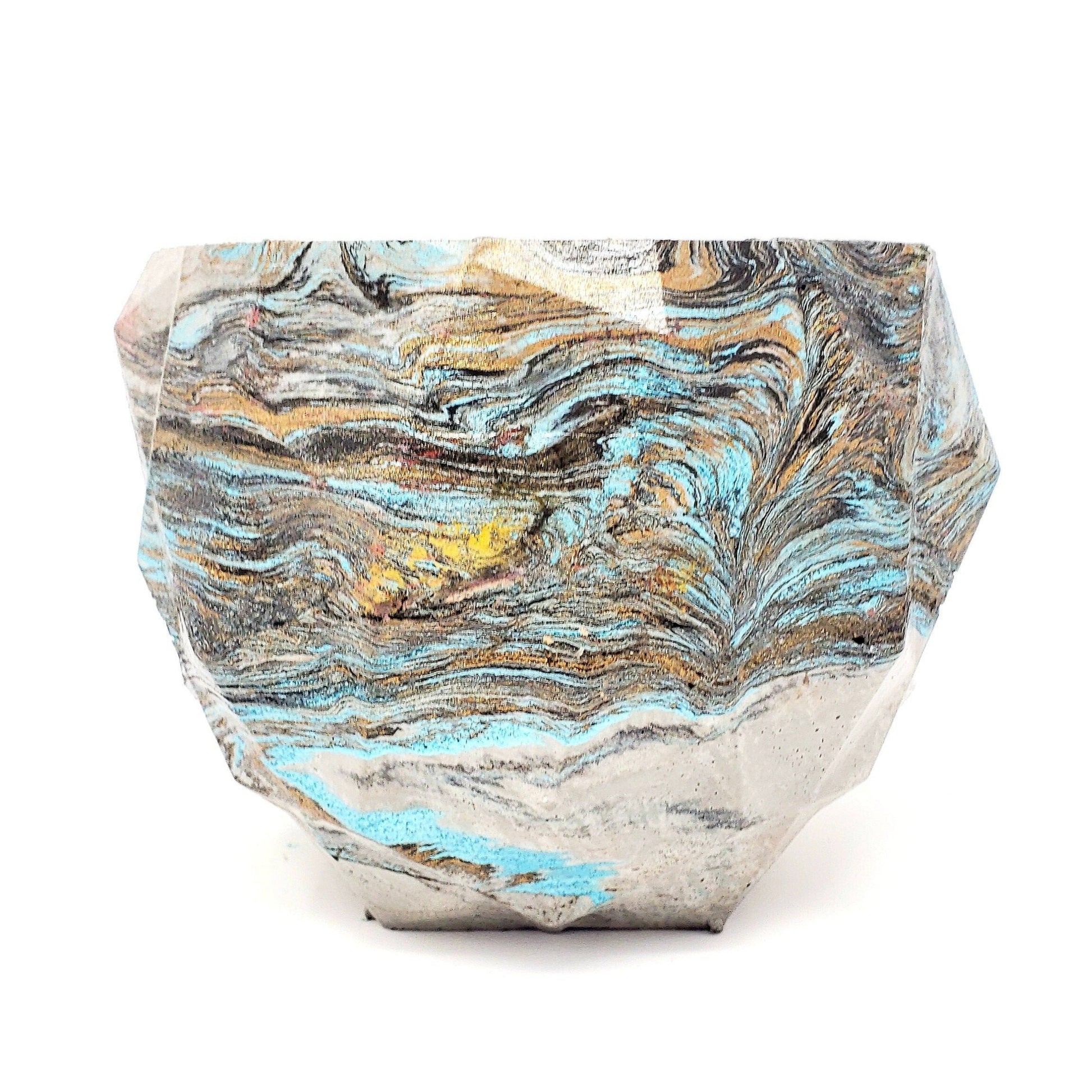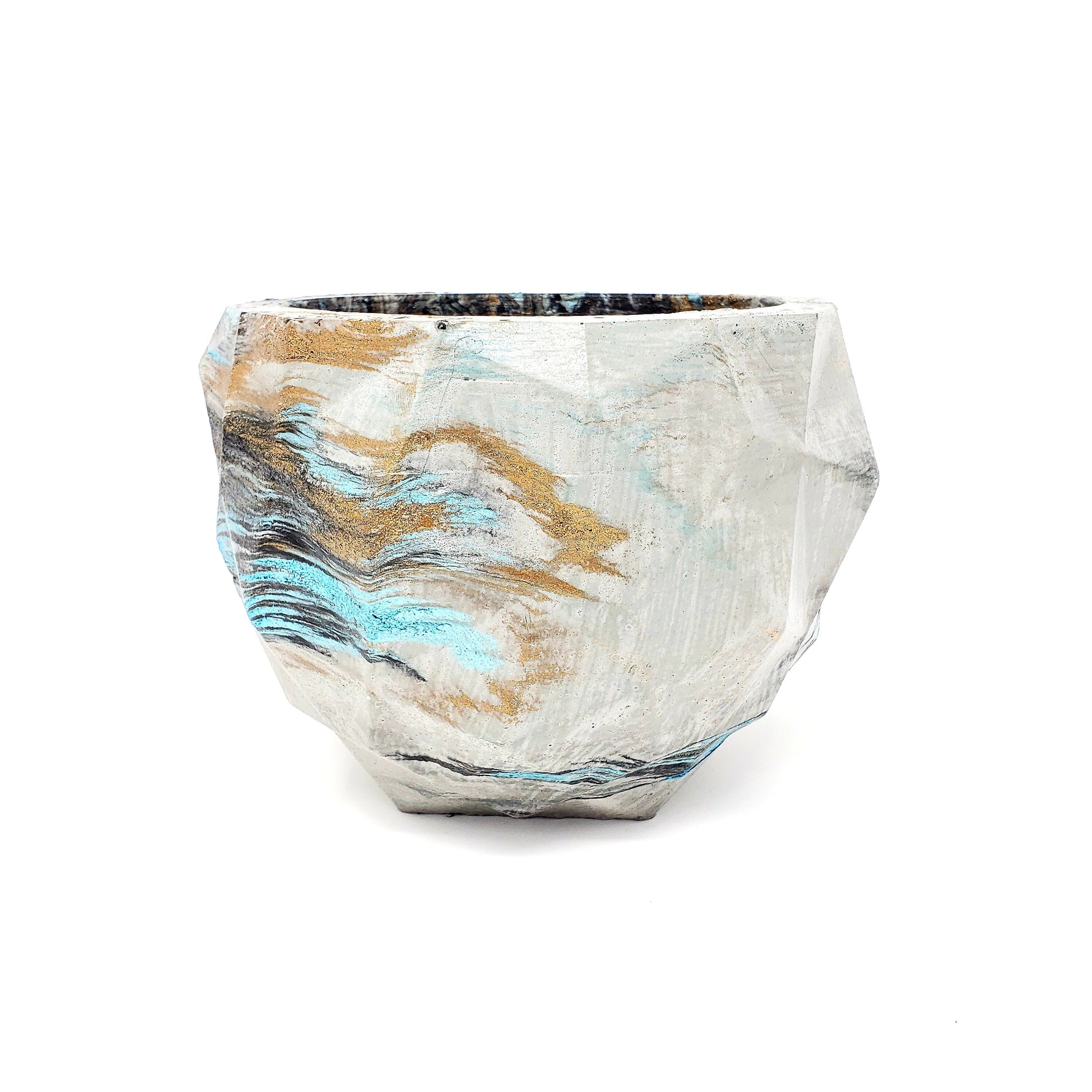 Personalize your space with a geometric concrete planter. A large, sleek, and solid geometric concrete plant pot with many edges and faces that gleam in the sun and cast interesting shadows. Entirely handmade from concrete, the edgy planter pot has a multicolor, textured effect, although the one in the examples has a blue-black color combination, each planter will be unique, the same color but texture will vary. Bring some color and greenery to your space with a planter made just for you!