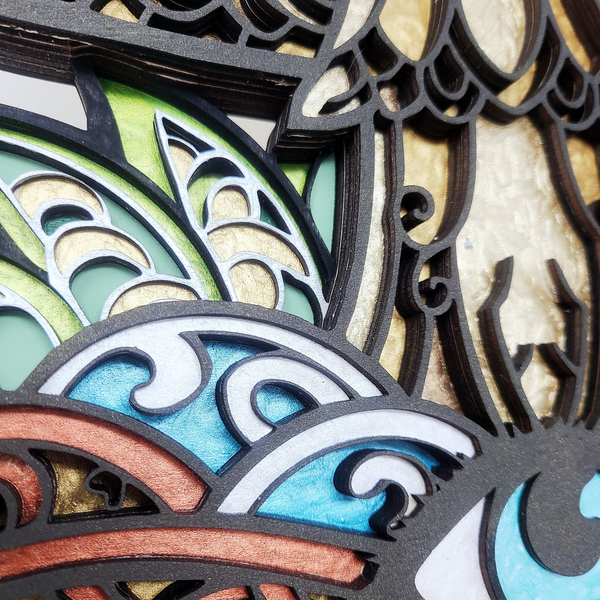 Finish: Hand-painted and stained wood layers